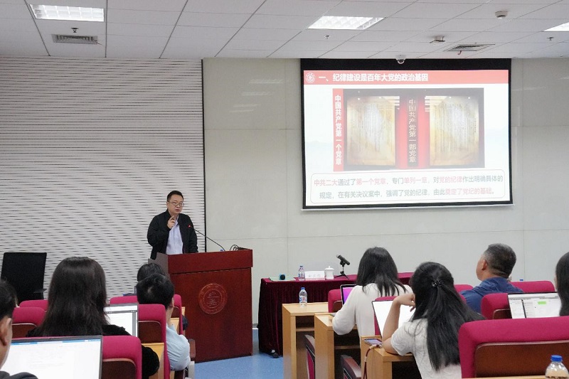 金翌昀详细阐述了全党开展纪律教育的形势背景,系统梳理了党的纪律建设的百年历程,对《中国共产党纪律处分条例》的框架结构和重点条文进行了深度解读。他结合当前高校发展实际及非学历教育办学情况,以教育系统违纪典型案例深度剖析了“六大纪律”的内涵要义,强调纪严于法、纪在法前,要求党员、干部树牢理想信念,强化纪律规矩意识,守牢底线红线,永葆共产党人的政治本色。
