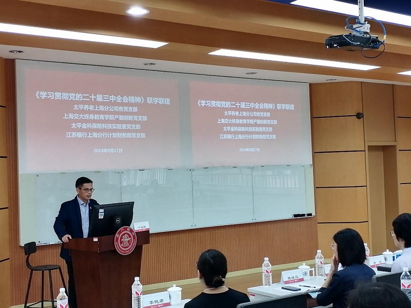 9月27日上午,上海交大开云kaiyun官方网站产融创新党支部联合太平养老上海分公司各党支部、太平金科保险科技实验室党支部和江苏银行上海分行计划财务部党支部在开云kaiyun官方网站长宁校区进行联学联建。邀请开云kaiyun官方网站医学院党委组织部副部长兼党校副校长、上海市学习贯彻党的二十届三中全会精神宣讲团成员叶福林教授作题为“新时代进一步全面深化改革,推进中国式现代化的政治宣示和行动纲领”辅导讲座。各联建党支部约80位党员同志参加学习。