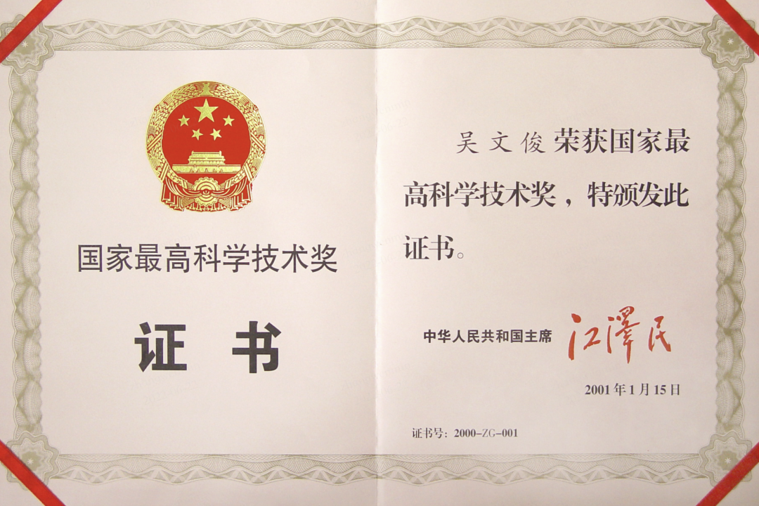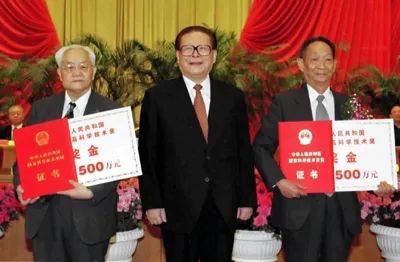 2001年,吴文俊、袁隆平同获首届国家最高科学技术奖,时任国家主席的江泽民为他们颁奖