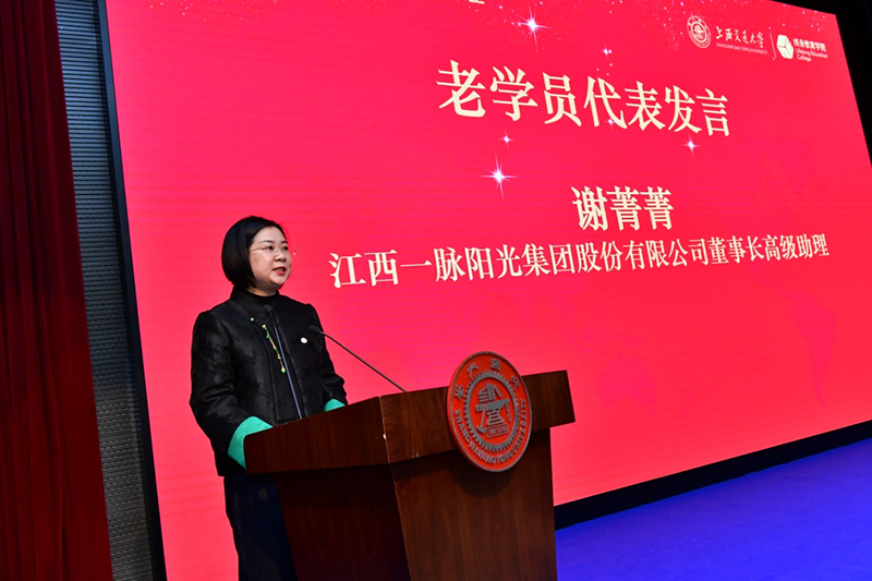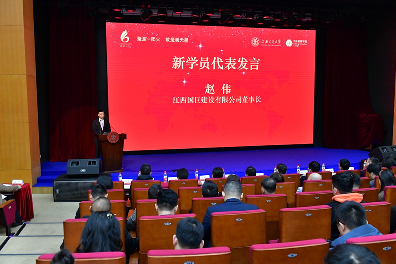 【学员代表发言】 往期学员代表江西一脉阳光集团股份有限公司董事长高级助理谢菁菁同学分享了在领军人才培训班一年的学习经历与感悟。本期班级新生代表江西国巨建设有限公司董事长赵伟同学表示一定会珍惜难得的学习机会,虚心向学。
