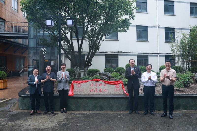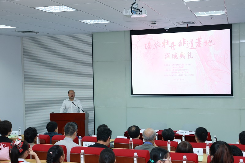 在长宁校区“法华牡丹非遗基地”前,与会嘉宾和领导共同为基地揭牌。