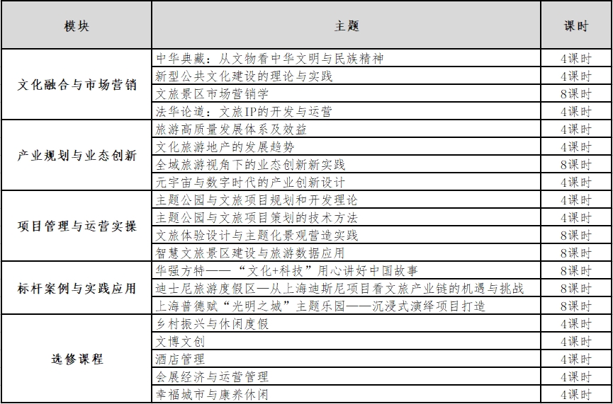 本研修班主要包含文化融合与市场营销、产业规划与业态创新、项目管理与运营实操、标杆案例与实践应用四个模块