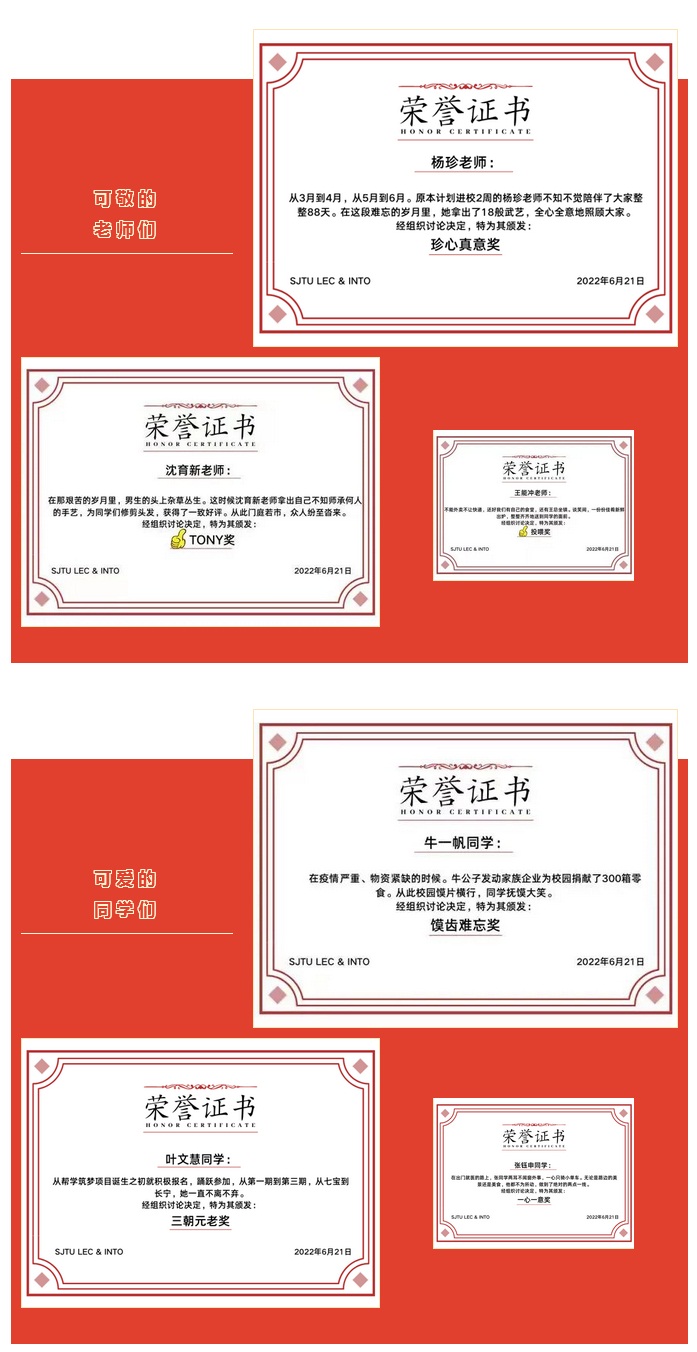 典礼最后,我们通过表彰的方式来记录一些难忘的故事与故事中可爱可敬的老师与同学们,感谢他们在这段特殊时间里的付出与陪伴。