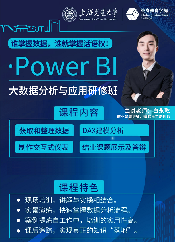 《Power BI 大数据分析与应用研修班》是面向对大数据分析有兴趣的相关工程技术人员开设的公开课,全年滚动开班。公开课的特色包括:(1)现场培训,讲解与实操相结合;(2)实景演练,快速掌握数据分析流程;(3)案例提炼自工作中,培训的实用性高;(4)课后追踪,实现真正的知识“落地”。
