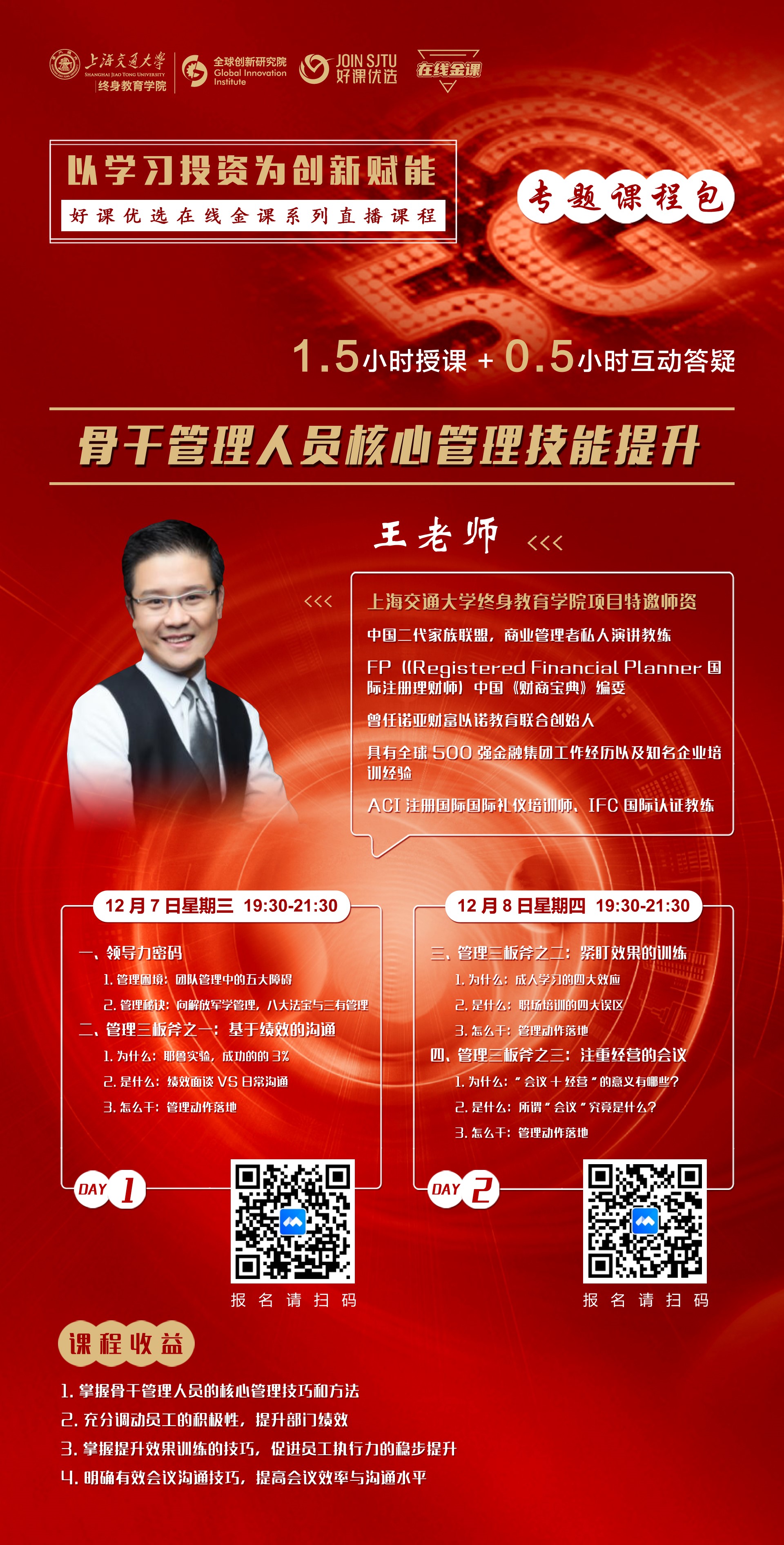 12月7日、8日两晚19:30,好课优选在线金课将开启专题课程包——《骨干管理人员核心管理技能提升》,由开云kaiyun官方网站项目特邀师资、中国二代家族联盟、商业管理者私人演讲教练、诺亚财富以诺教育联合创始人王曦庭老师授课。