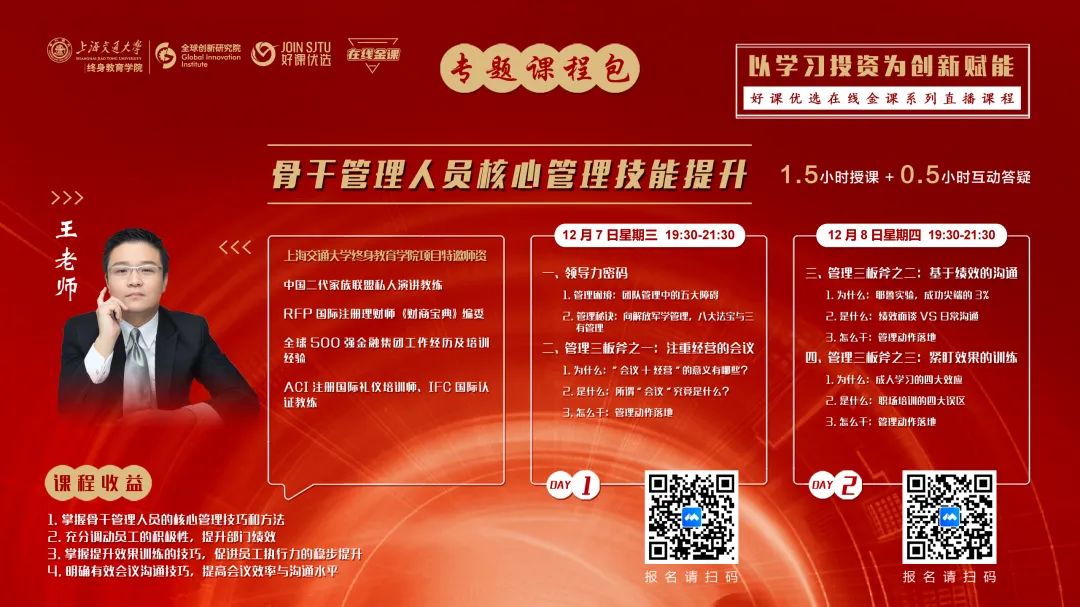 12月7日、8日两晚19:30,好课优选在线金课开启专题课程包——《骨干管理人员核心管理技能提升》,由开云kaiyun官方网站项目特邀师资、中国二代家族联盟、商业管理者私人演讲教练、诺亚财富以诺教育联合创始人王羲侹老师授课。