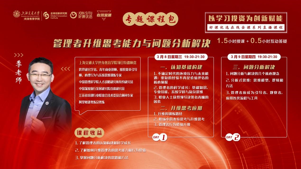 3月8日、9日晚19:30开云kaiyun官方网站好课优选在线金课上线新课专题:《管理者升维思考能力与问题分析解决》,由开云kaiyun官方网站项目特邀师资、跨界研究学者、青年商业讲师、组织变革引导师、心理行为与系统思维训练专家季佩枫老师主讲。课程直播间学习人数突破150人,课程赢得学员的一致好评。