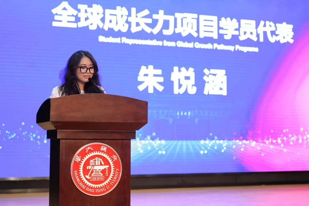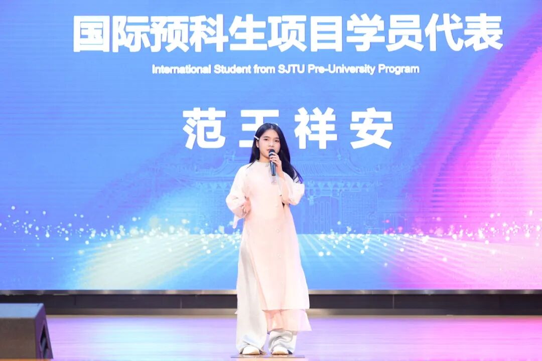范玉祥安(越南)和朱悦涵两位同学分别作为国际预科生项目和全球成长力研修项目的新生代表发言,她们共同展现了作为“交大新声”的期待。范玉祥安以“麻辣火锅”巧妙比喻多元文化的融合过程,坦言挑战虽在,但已准备好沉浸其中、勇敢探索。朱悦涵则分享了她对国际教育的向往,并引用“改变从我们开始”激励所有同学以开放心态拥抱未来。