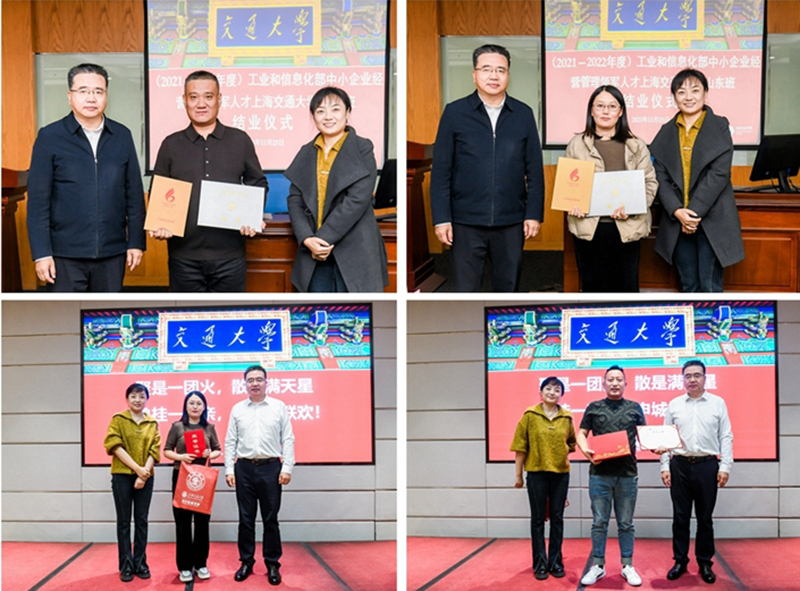 随后,山东瑞宁电气有限公司总经理逯文娟、山东益源环保科技有限公司副总经理李斌分别代表2021-2022届的班委和学员进行了交流发言,结合学习感受和自身企业发展实际,回忆了在领军人才培训期间的收获与感悟,表示要秉承交大精神和领军精神,不断突破自我、开拓创新,创造世界优质产品和服务。与会领导为结业学员、优秀学员颁发结业证书,并合影留念。